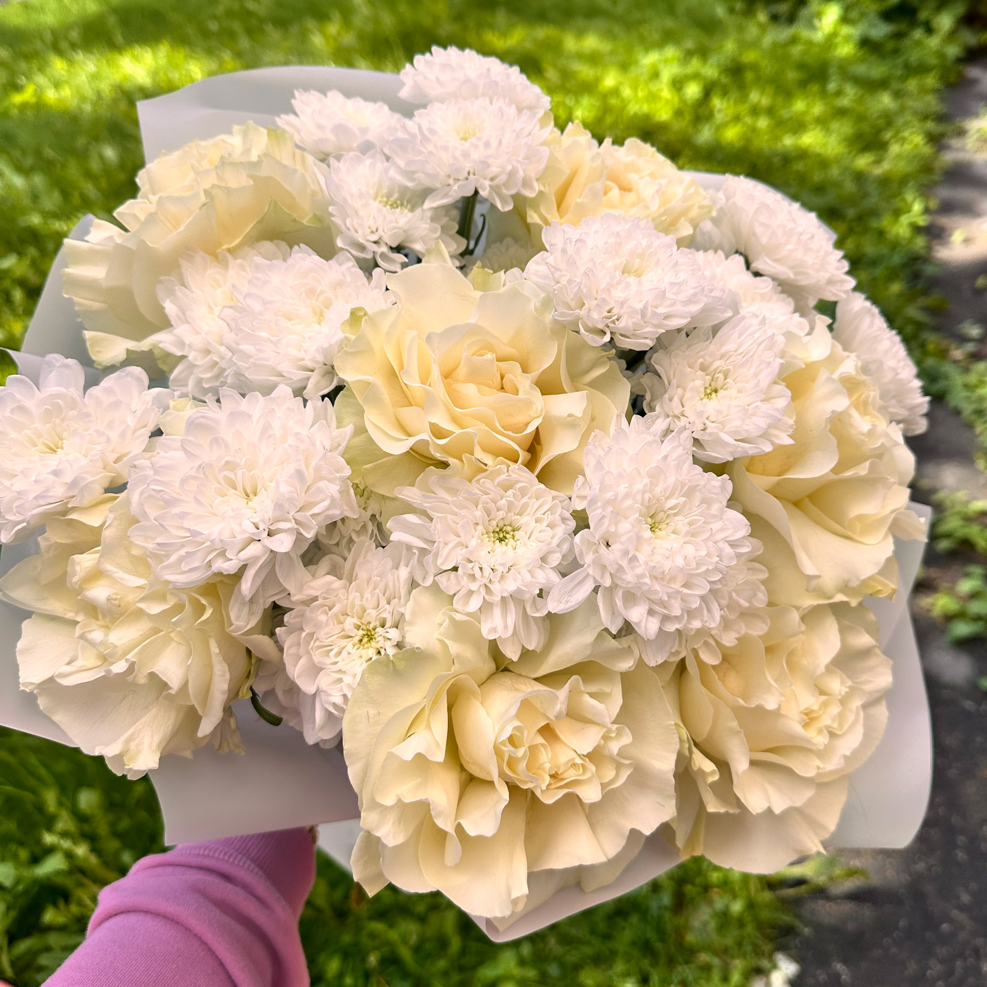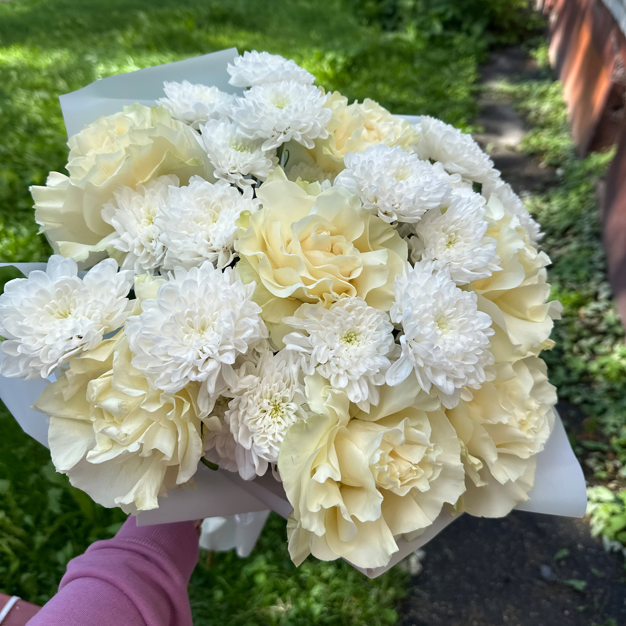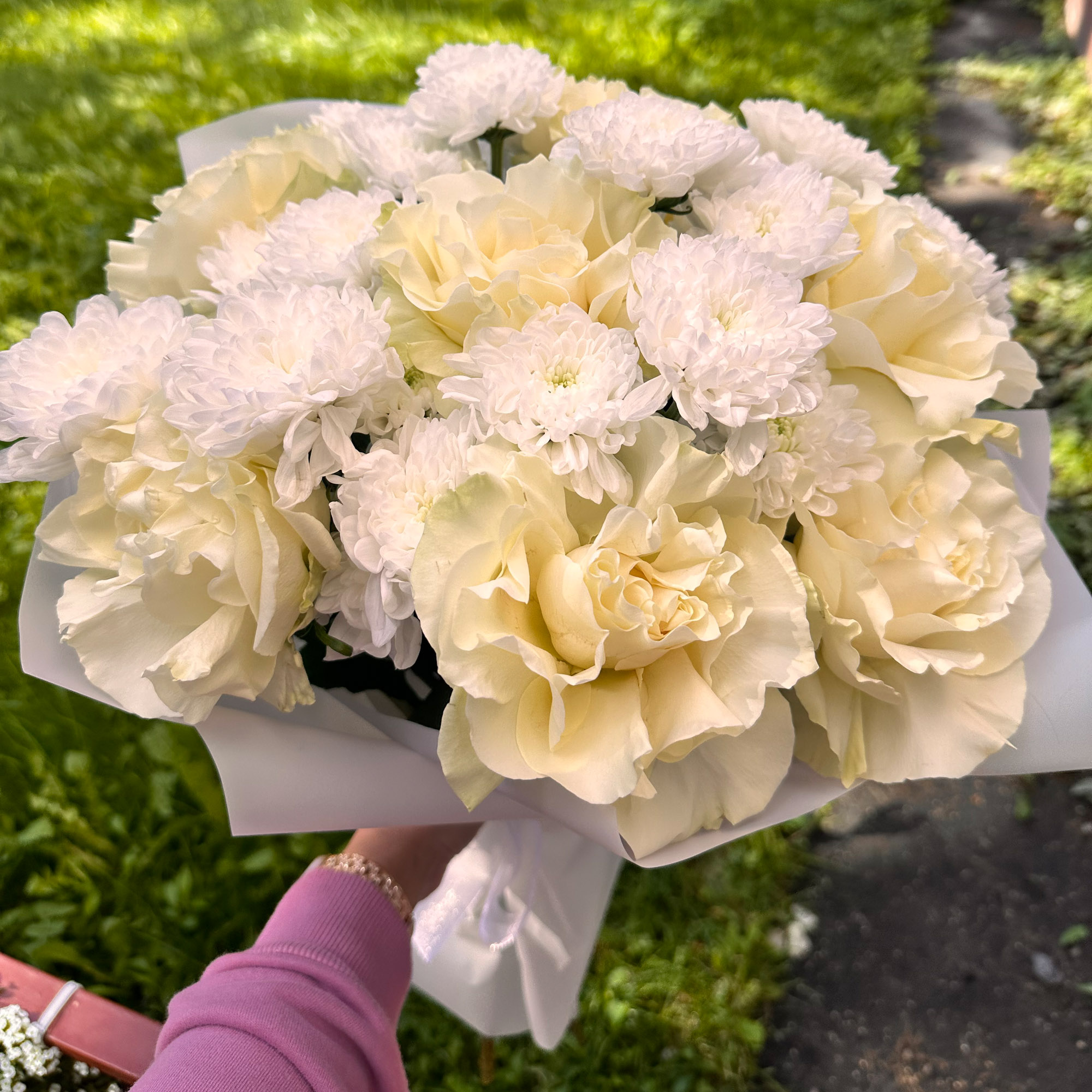 Нежный букет с белыми розами Мондиаль и хризантемами Алтай.