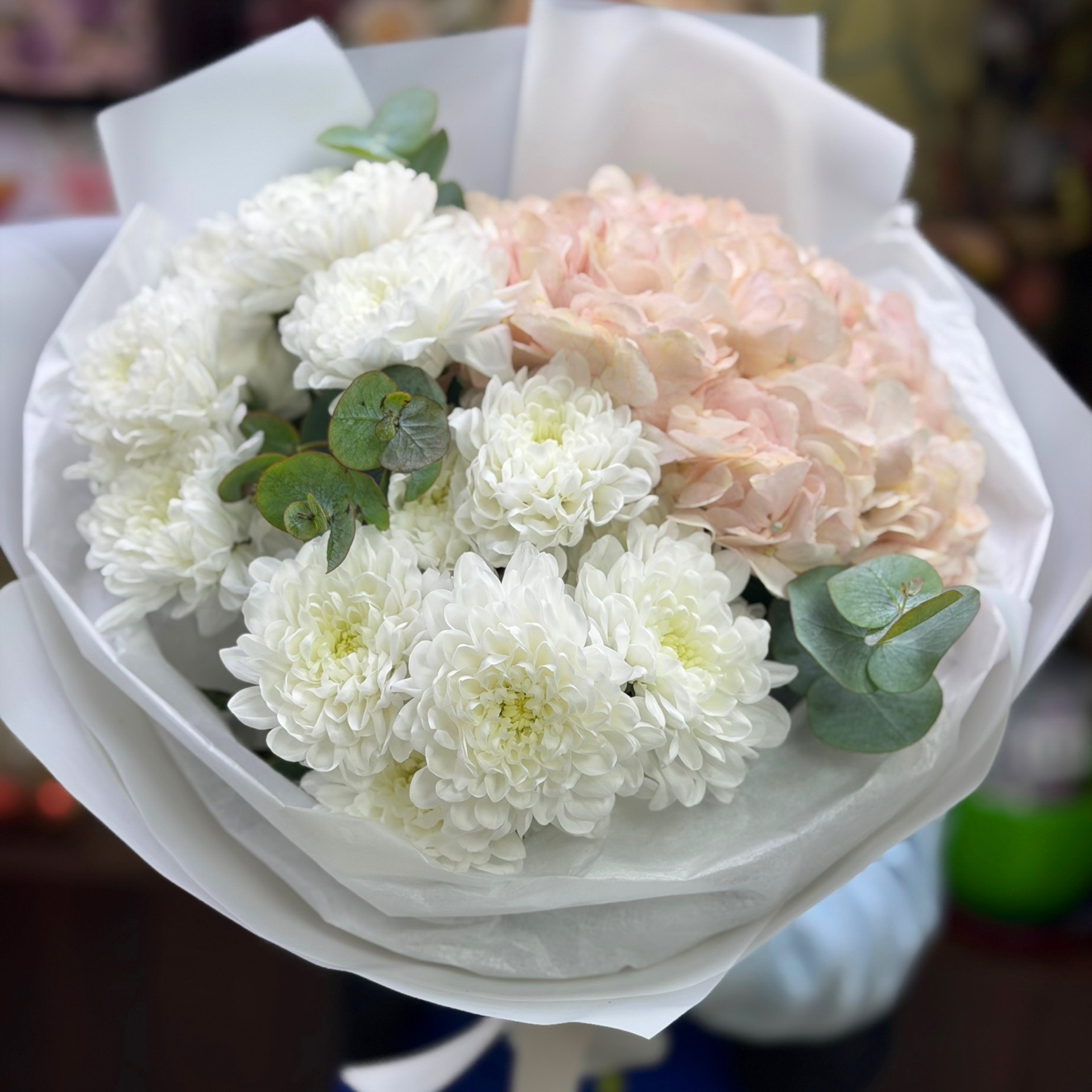 Нежный букет из розовой гортензии и белых хризантем Алтай с эвкалиптом.