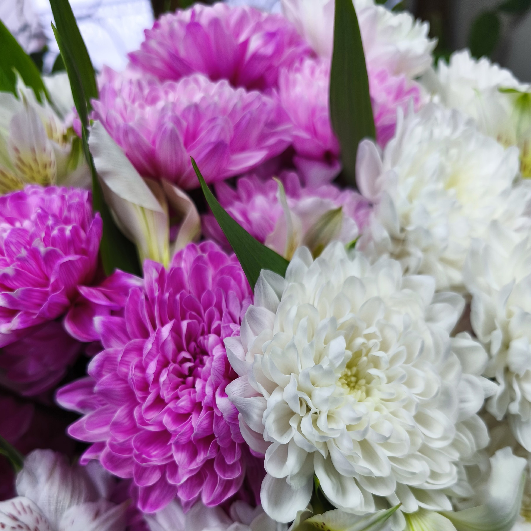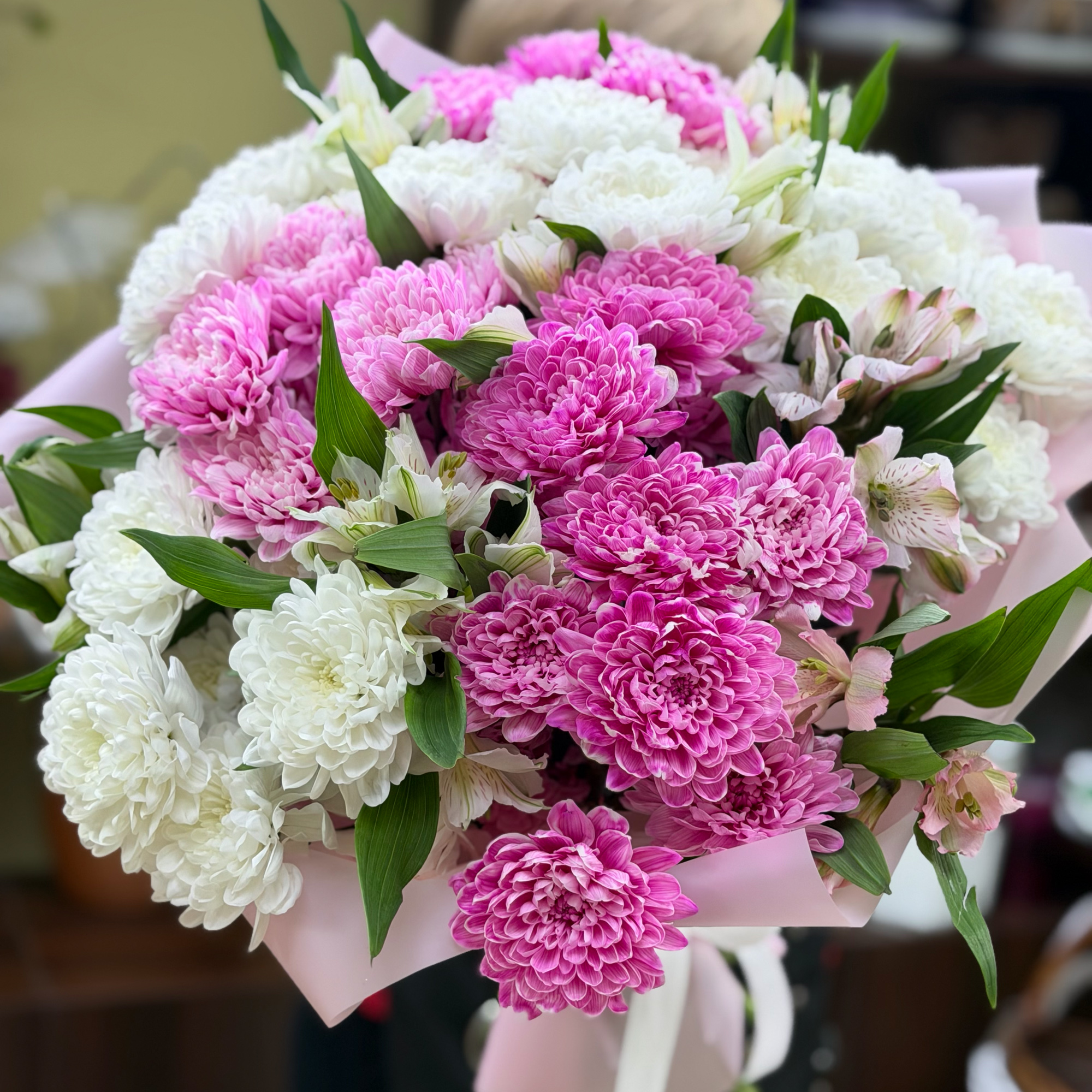 Нежный букет в белых тонах из очень стойких позиций: кустовой хризантемы, альстромерии. Этот букет будет долго радовать своей красотой
