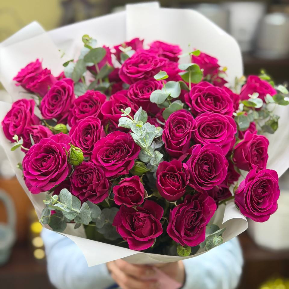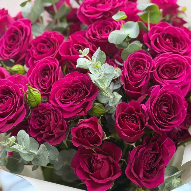 11 кустовых роз с эвкалиптом