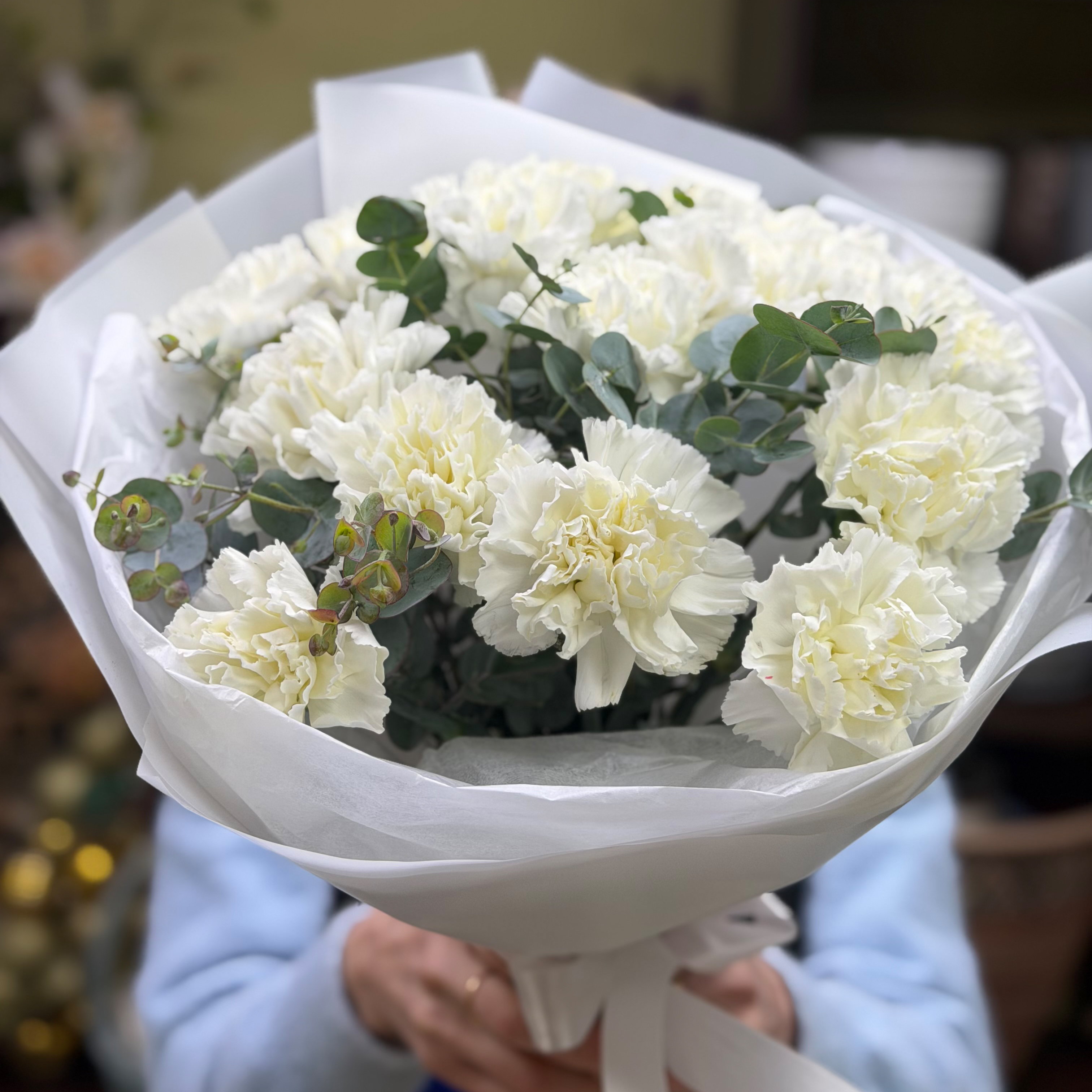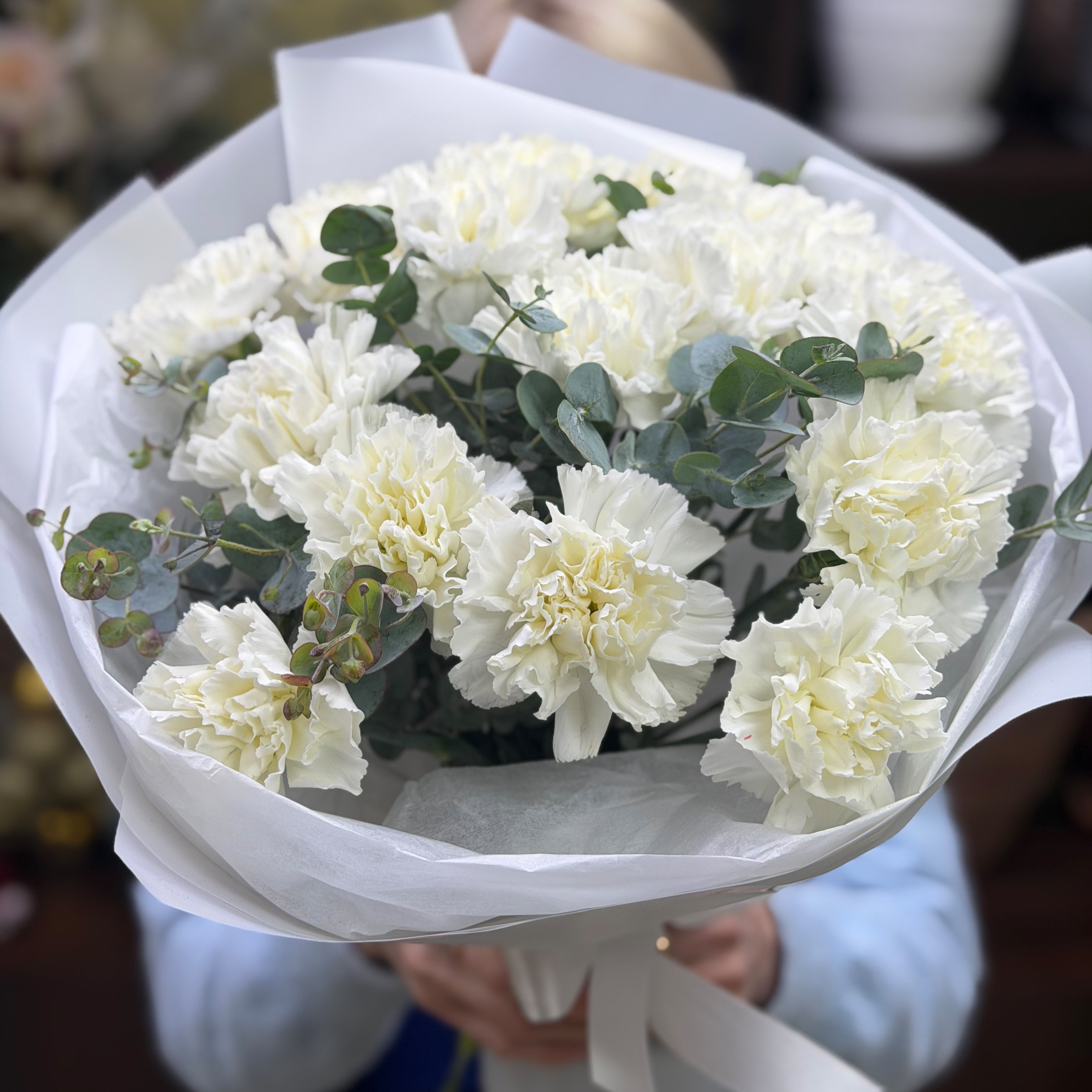 Монобукет из 15-ти белых диантусов (гвоздик) в стильном оформлении с эвкалиптом.