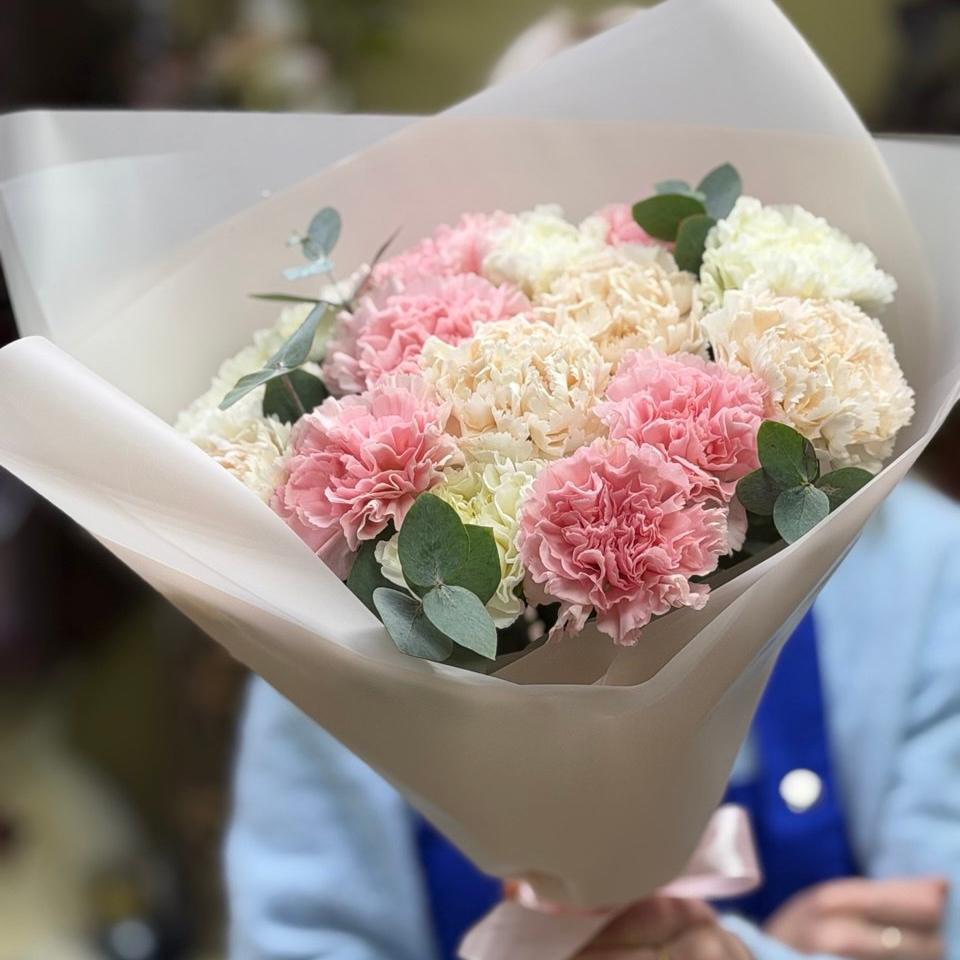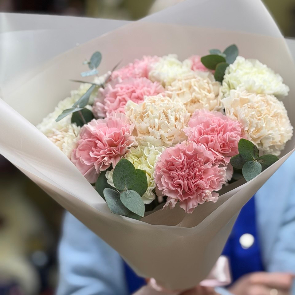 Монобукет из 15-ти разноцветных диантусов (гвоздик) в стильном оформлении с эвкалиптом.