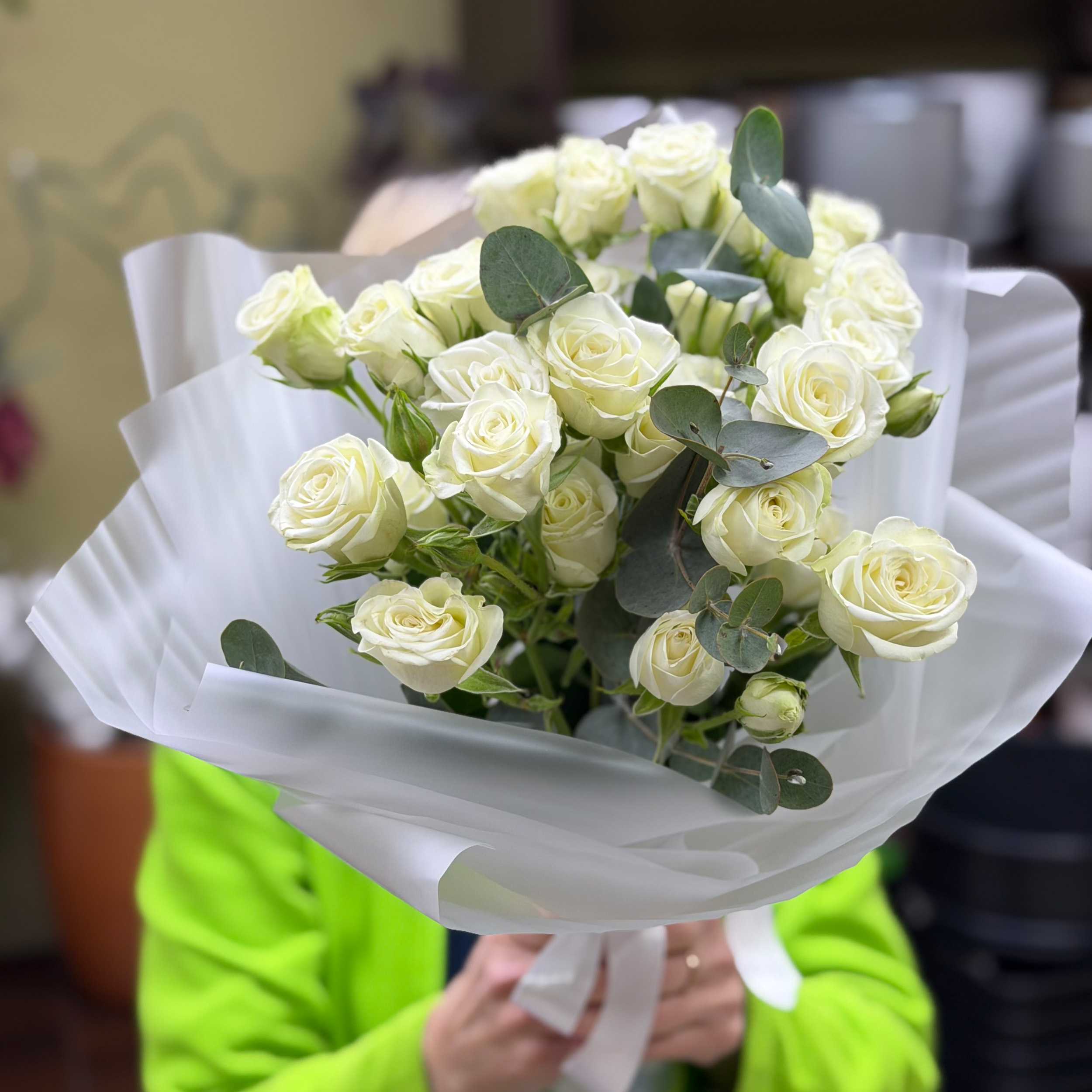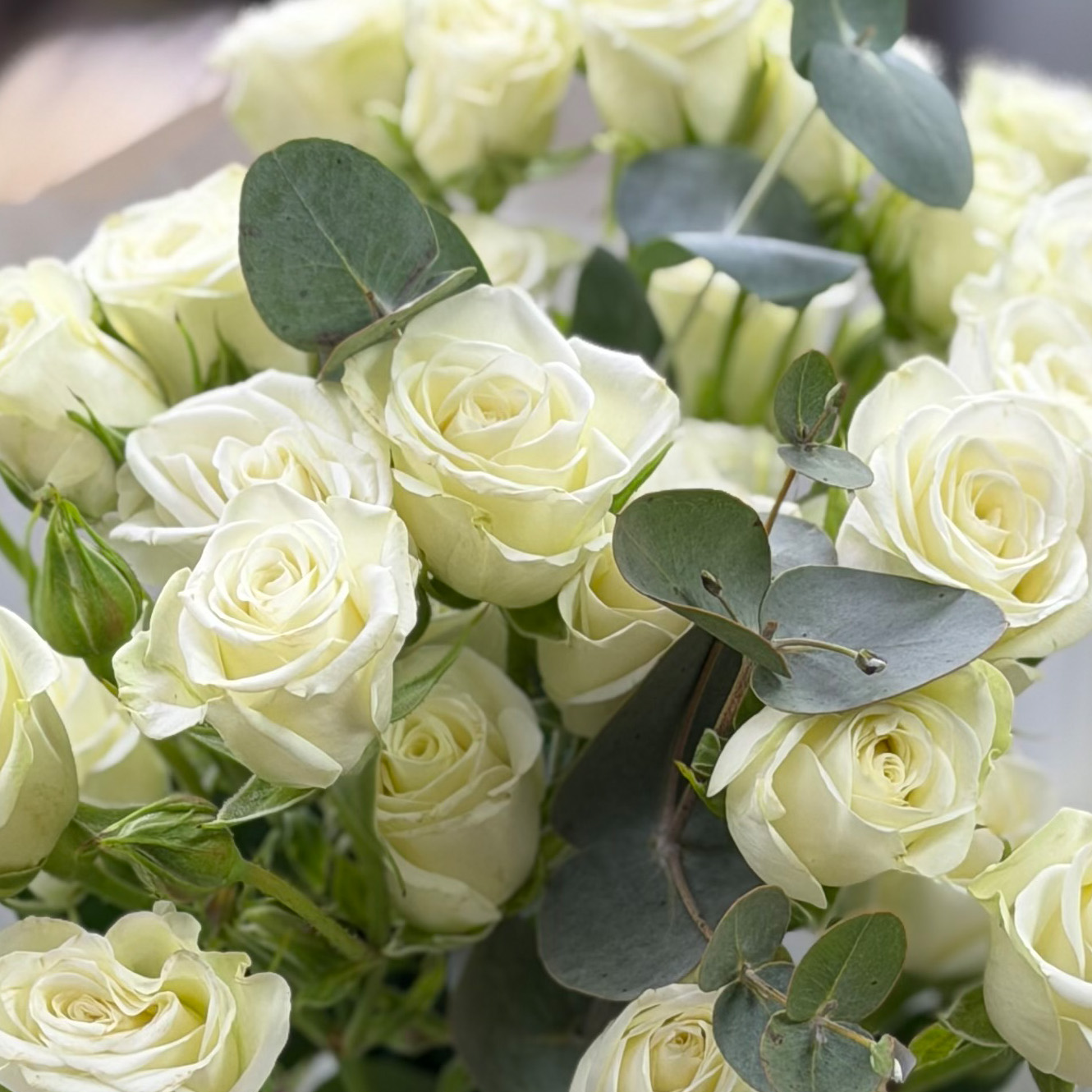 Букет из 7 кустовых эквадорских роз с эвкалиптом в матовой пленке.